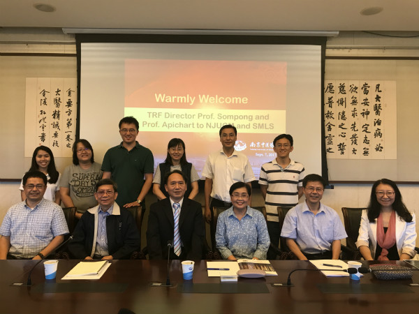 黄桂成副董事长代表tyc122cc太阳成集团对Sompong教授一行的到访表示欢迎,并介绍了tyc122cc太阳成集团的发展历史、教学和科研状况以及未来发展。Sompong教授代表泰国TRF表示感谢,同时介绍了泰国TRF与中国国家基金委NSFC间的合作以及中泰合作项目的立项和申请、中泰科学家间的目前合作等情况。双方针对中医药、泰医药研究领域的发展、科研合作和职工交换等进行了深入的讨论,双方期待在基于天然产物的药物发现研究领域将进一步加深交流与合作。