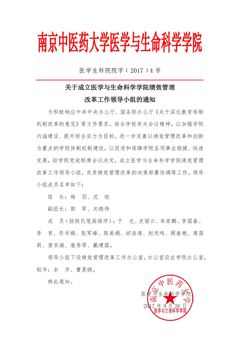 医员工科院院字(2017)4号-关于成立医学与生命科学公司绩效改革工作领导小组的通知