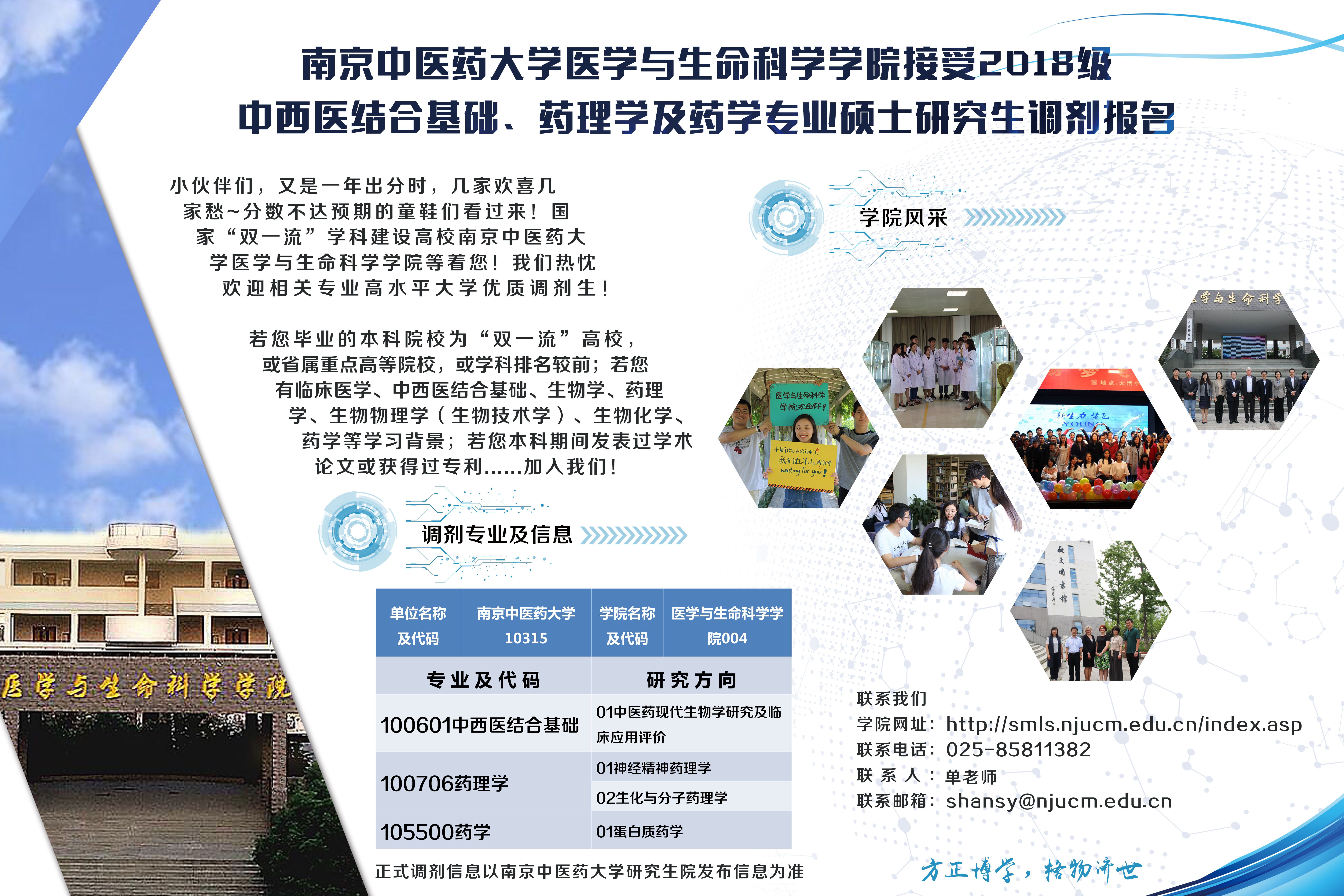 tyc122cc太阳成集团医学与生命科学公司接受2018级中西医结合基础、药理学及药学专业硕士研究生调剂报名