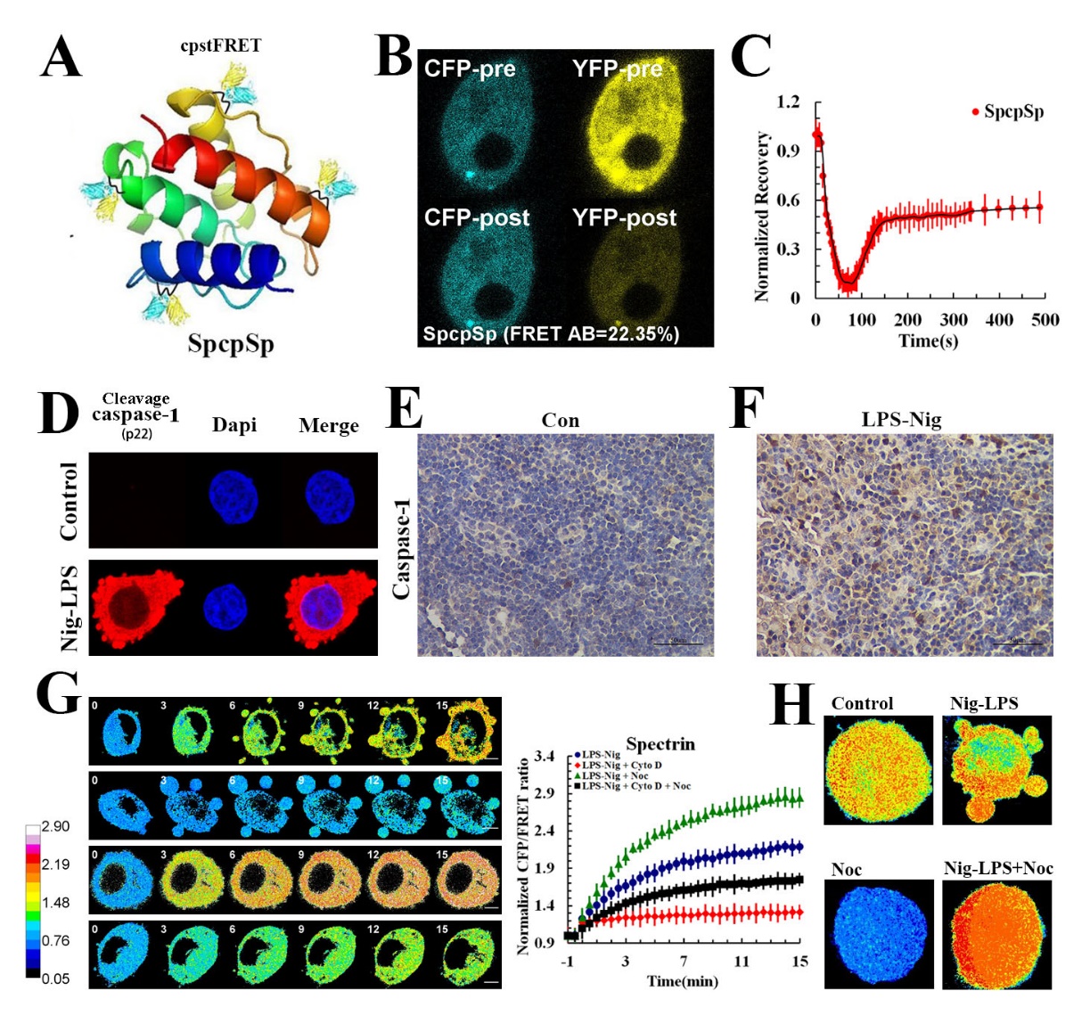 细胞焦亡(Pyroptosis)是以细胞膨胀、胞膜出泡和破损为特征的程序性细胞损伤现象,其细胞形态变化依赖于血影蛋白(spectrin)介导的膜骨架结构改变,这一变化同样密切联系于细胞内张力的改变及其对血影蛋白的牵拉力学作用。通过检测细胞焦亡过程中胞内骨架结构张力变化及其对血影蛋白的力学效应,能有效识别调控胞膜形状改变的力学调控机制,揭示细胞焦亡与胞内力学活动相关的分子机制,为临床相关抗肿瘤药物研发提供新的研究方向。