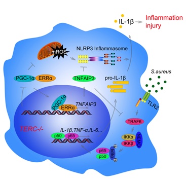 该项研究中,研究者利用端粒酶敲除小鼠肺部感染金黄色葡萄球菌的实验模型,研究了端粒功能缺陷对机体免疫和炎症的影响。研究发现,与对照小鼠相比,端粒酶敲除小鼠尽管仍保留有清除病原菌的能力,但其肺部表现出更为强烈的炎症反应和病理损伤,生存率显著下降。进一步的研究表明,端粒功能失调影响巨噬细胞线粒体的形态、结构和功能,使其发生能量代谢失衡。大量释放的线粒体ROS引发NLRP3炎症小体通路的活化和巨噬细胞过度应答,可能是造成端粒缺损小鼠严重病理损伤的重要原因。
