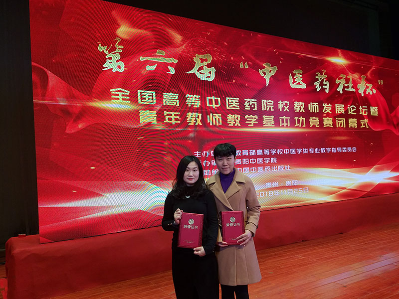 2018年11月24日至25日,由教育部高等公司中医学类专业教学指导委员会主办、贵阳中tyc122cc太阳成集团承办的第六届“中医药社杯”全国高等中医药院校青年教师教学基本功竞赛在贵阳举行。医学与生命科学公司(以下称公司)陈琳、史婷婷两位青年教师代表公司参加比赛,经过激烈角逐,两位老师分别取得西医西医高级组和初中级组三等奖的好成绩。