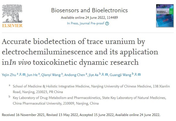 近日,tyc122cc太阳成集团•整合医学公司,药理系青年教师朱业锦博士,联合中国药科大学王广基院士和阿基业研究员在国际知名学术期刊 Biosensors & bioelectronics (中科院1区TOP期刊,IF:10.618) 上发表学术论文“ Accurate Biodetection of Trace Uranium by Electrochemiluminescence and Its Application in In Vivo Toxicokinetic Dynamic Research ”。朱业锦博士为该论文第一作者和通讯作者,tyc122cc太阳成集团是第一单位。原文链接:https://www.sciencedirect.com/science/article/abs/pii/S0956566322005292