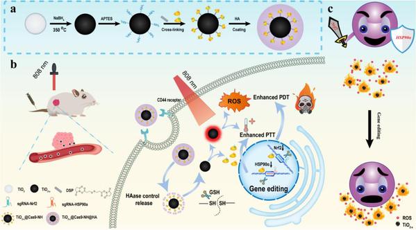 针对以上关键科学和技术问题,tyc122cc太阳成集团韩欣教授联合南京大学宋玉君教授、江苏省人民医院管晓翔教授,基于缺陷二氧化钛(TiO2-x)多功能纳米载体成功构建了肿瘤微环境响应型的CRISPR基因编辑纳米系统,实现了近红外光触发的黑色素瘤光疗增敏和癌症杀伤效果。在这个智能响应性的基因编辑纳米治疗体系里, 包裹在载体表面的透明质酸(HA)和共价连接Cas9蛋白于TiO2-x表面的二硫键(S-S)分别负责响应肿瘤微环境中的透明质酸酶(HAase)和谷胱甘肽(GSH)。当该纳米药物进入肿瘤微环境后,肿瘤部位富集的HAase和GSH可轻易破坏其表面的透明质酸和内部的二硫键,释放出Cas9/sgRNA蛋白复合体进行特定部位的基因编辑。近红外光刺激能够激活功能化的TiO2-x纳米粒子,使其同时具备光动力治疗(PDT)和光热治疗(PTT)效果。为了进一步提高肿瘤光疗效果和降低毒副作用,该体系通过双靶向NRF2和HSP90α基因编辑分别提高肿瘤PDT和PTT的耐受敏感度,即采用低剂量的光照就可以同时提高肿瘤细胞的ROS水平以及降低肿瘤细胞的光热耐受性,达到“一石二鸟”的治疗功效。该研究通过基因编辑靶向应激(氧化/热)缓解调节因子(NRF2/HSP90α),降低肿瘤细胞对于外力干预治疗的应激耐受性,为通过阻断应激信号通路实现有效杀伤肿瘤同时降低毒副作用的癌症临床治疗提供了新的策略和方法。另外,该工作也实现了肿瘤微环境响应性的双靶标基因敲低,为靶向特定细胞类群的精准基因编辑和癌症等疾病的精准医疗提供了新的工具。硕士研究生李泽昆为该论文的第一作者,韩欣教授为最后通讯作者,该项研究获得国家自然科学基金项目(31901010, 21874066, 81601632)、江苏高校优势团队建设工程资助项目(中西医结合)、江苏省特聘教授自然科学类资助人才项目、江苏省“双创计划”团队项目、江苏省中药资源产业化过程协同创新中心重点项目(ZDXM-2020-12)等资助。