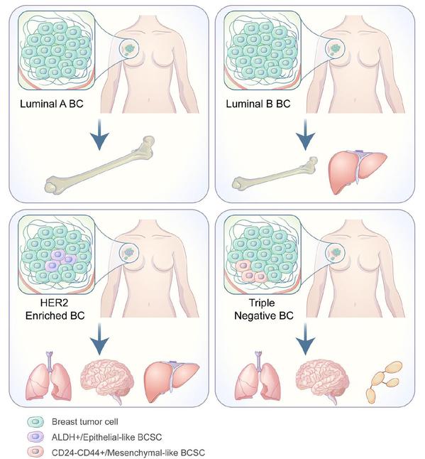 此外,课题组还在Journal of Experimental & Clinical Cancer Research期刊在线发表题为“Heterogeneity of BCSCs contributes to the metastatic organotropism of breast cancer”的综述文章,该论文讲述了乳腺癌肿瘤干细胞异质性对于肿瘤转移器官选择性的影响,同时也总结和评估了基于BCSCs相关肿瘤疗法临床试验的安全性和有效性,对晚期转移性乳腺癌的诊断和治疗提供了新的见解和思路,韩欣教授为该文章的共同通讯作者。