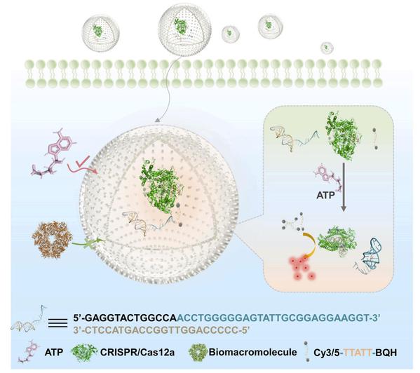 同时,课题组还在Biosensors and Bioelectronics期刊在线发表题为“Hollow covalent organic framework-sheltering CRISPR/Cas12a as an in-vivo nanosensor for ATP imaging”的文章,该工作通过设计中空共价有机框架(COFs)包裹的酶催化体系实现了基于CRISPR/Cas12a技术的体内高效、稳定的ATP成像和检测。该方法通过制备COFs对关键酶进行封装以进行保护和体内递送,不仅有助于基于CRISPR-Cas系统在疾病检测领域的开发和拓展,同时也可以广泛应用于其他蛋白质在临床诊断、医学研究和仿生纳米器件中的工作场景,韩欣教授为该文章的共同通讯作者。