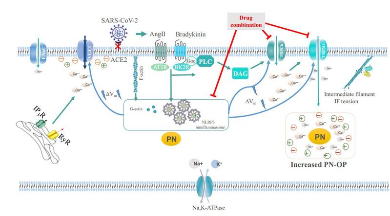同时引用纳米“双电层压缩”理论和唐南效应,解析蛋白纳米颗粒生成通过吸附阳离子,导致肺泡细胞超极化,激活L-VGCC等电压依赖离子通道,调控钙离子内流;然而,化学信号激活的非选择性阳离子通道也参与了钙离子内流调控。这两种途径的钙信号都能以电压依赖的方式激活 Sur1-TRPM4 通道,协同诱导钠离子内流、胞内高渗和水肿发生。本研究还充分借鉴中西药联合使用多靶点治疗优势,筛选下调细胞渗透压和抑制肺水肿发生的新药物组方,为炎性肺水肿治疗提供新药理机制及新治疗药方。继而改善急性呼吸窘迫综合征及重症新冠患者治疗面临的窘境,充分发挥中西药联合治疗疑难病症的医学新优势。