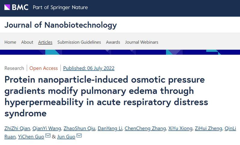 近日,tyc122cc太阳成集团•整合医学公司郭军教授团队在Journal of Nanobiotechnology期刊 (IF: 10.435) 上在线发表了最新研究成果“Protein nanoparticle-induced osmotic pressure gradients modify pulmonary edema through hyperpermeability in acute respiratory distress syndrome”的论文。郭军教授为责任通讯作者,该研究获得国家自然科学基金和中药学一流学科开放课题资助。