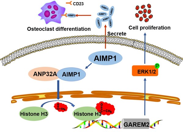 2022年8月杨烨、顾春艳教授课题组在Cancer Communications期刊上在线发表题为“AIMP1 promotes multiple myeloma malignancy through interacting with ANP32A to mediate histone H3 acetylation”的研究论文。该研究首次在体内外实验中发现AIMP1促进MM细胞增殖。其后机制研究揭示,AIMP1主要通过与ANP32A相互作用调节组蛋白H3乙酰化(acetyl-H3)从而促进GAREM2功能富集,进而调控MAPK/ERK信号通路影响MM细胞增殖。此外,AIMP1作为细胞因子可以促进破骨细胞分化,影响肿瘤微环境。载有AIMP1 siRNA的外泌体能有效抑制PDX模型小鼠的肿瘤生长及NOD/SCID-TIBIA MM模型小鼠的溶骨性损伤。该研究系统阐释了AIMP1介导acetyl-H3促进MM细胞恶性增殖的机制,为MM提供了新的诊断和治疗靶标,同时外泌体作为其靶向药物或抑制剂的载体具有广阔的应用前景。博士研究生魏荣芳为该论文第一作者,朱妍硕士、张园娇博士为共同第一作者,杨烨教授、顾春艳教授为共同通讯作者。该研究获得国家自然科学基金(82173849)、江苏省优秀青年科学基金项目(BK202000097)、江苏省高等院校重点学科发展项目(中西医结合)、江苏省研究生科研与实践创新计划(KYCX21_1769,KYCX20_1451)等项目资助。