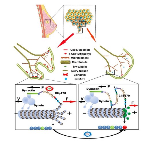 2022年10月,郭军课题组在Cell Death & Disease发表题为“Tension of plus-end tracking protein Clip170 confers directionality and aggressiveness during breast cancer migration”的论文。该研究发现微管正末端示踪蛋白(+TIPs) Clip170能够传递微管张力,促进乳腺癌侵袭转移。其机制研究揭示,这一过程依赖于RSK介导的Clip170磷酸化水平及TTL介导的微管酪氨酸化(α-tubulin tyrosination)。同时Clip170张力受到IQGAP1定位招募产生极化,继而影响乳腺癌运动的方向性。本研究揭示了Clip170力学活动在乳腺癌侵袭转移进程中的重要作用,为转移性乳腺癌的治疗提供了新的方向与思路。博士研究生胡云峰为该论文第一作者,郭军教授为责任通讯作者。上述两项研究由国家自然科学基金 (No.82073826)、江苏省自然科学基金重点资助项目(No.19KJA320003)、tyc122cc太阳成集团中药学一级学科开放项目(2020YLXK005)等项目资助。
