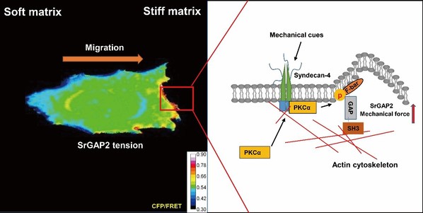 2022年11月,郭军教授课题组在Theranostics发表题为“Stiff matrix induced srGAP2 tension gradients control migration direction in triple-negative breast cancer”的论文。该研究发现F-Bar结构域蛋白srGAP2参与了乳腺癌细胞趋硬性迁移。机制研究揭示,在体外构建的细胞趋硬性迁移矩阵中,srGAP2张力呈现极化分布状态,其细胞运动前端的srGAP2张力增强是维持乳腺癌细胞趋硬性迁移的必要条件。PKCα介导的srGAP2 Ser206磷酸化参与了srGAP2张力调控,其在细胞运动前端的募集是导致srGAP2张力极化的主要原因。跨膜黏附蛋白SDC4参与了PKCα在细胞前端的募集,是细胞外机械信号传递至细胞内的始动因子。该研究阐明了SDC4-PKCα-srGAP2信号通路参与乳腺癌趋硬性迁移的调控,揭示了细胞在复杂环境下的运动调控机制,为抑制乳腺癌侵袭转移治疗提供了新的方向与思路。博士研究生李尘为该文第一作者,郭军教授为责任通讯作者。