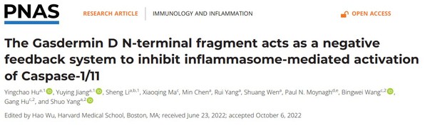 2022年11月02日,tyc122cc太阳成集团•整合医学公司胡刚教授课题组与南京医科大学杨硕教授课题组的合作研究成果发表在PNAS,论文题目为“The Gasdermin D N-terminal fragment acts as a negative feedback system to inhibit inflammasome-mediated activation of Caspase-1/11”(图一),该研究揭示了固有免疫细胞焦亡效应分子GSDMD负反馈调控炎症小体激活的新作用和分子机制,为研发靶向炎症小体Caspases的抗炎药物提供了有益的学术基础。tyc122cc太阳成集团胡刚教授、王冰微副教授,南京医科大学杨硕教授为该论文共同通讯作者,研究工作得到国家自然科学基金委和科技部重点项目、重大专项等资助。
