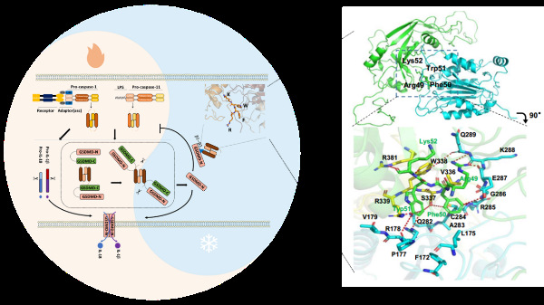 炎症小体是机体免疫系统中重要的固有免疫炎症蛋白质机器,参与对病原的宿主免疫防御反应,且与无菌性慢性炎症疾病发生密切相关。炎症小体是治疗炎症相关疾病可能的潜在重要靶点,解析炎症小体激活的调控机制对防治炎症性疾病发生具有重要意义。Gasdermin D(GSDMD)是炎症小体下游介导巨噬细胞焦亡的关键效应因子。在病原或体内危险信号刺激下,炎症小体可激活切割GSDMD分子,在质膜表面形成焦亡小孔,进而引发细胞炎性死亡。该文研究发现:焦亡效应分子GSDMD可通过活化产生的N端片段环RFWK基序作用Caspase-1/11酶催化中心,进而控制炎症小体Caspase 的过度激活和炎症反应发生(图二)。该论文首次揭示了炎症小体下游的负反馈调控机制,为靶向炎症小体Caspases的抗炎药物开发提供了新线索。(原文链接:https://doi.org/10.1073/pnas.2210809119)