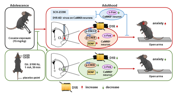 作者通过构建ACE雄性小鼠模型,采用CL局部注射多巴胺I型受体(D1R)拮抗剂或特异性敲低D1RCaMKII水平的方法,证实D1R介导的CL谷氨酸能神经元(D1RCaMKII)异常活化是ACE诱发成年小鼠焦虑样行为的关键机制,p-CREB和BDNF是D1RCaMKII的潜在下游靶标;靶向D1RCaMKII,戒断期在百会穴(GV20)和印堂穴(GV29)给予EA干预,显著降低ACE诱发成年小鼠的焦虑样行为。