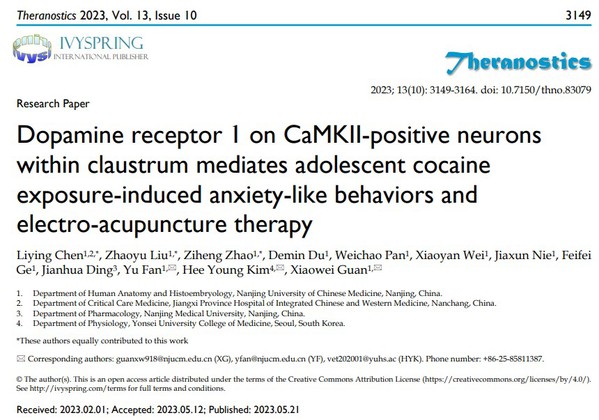 近日,tyc122cc太阳成集团•整合医学公司关晓伟/范宇团队在《Theranostics》(生物医学1区,2022 IF: 11.600)上发表论文,报道了靶向屏状核电针降低青春期接触可卡因的成年小鼠焦虑样行为的分子机制,为解析针刺戒毒的科学内涵提供了基础研究数据。