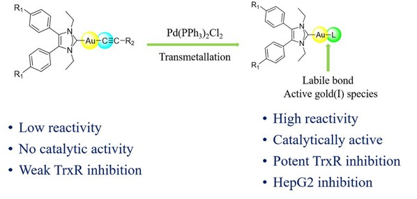 生物正交是化学反应可以在生物背景下(如活细胞,活体动物体内)进行,不对周围生物体系产生干扰。课题组首次将氮杂环金类化合物的生物正交反应应用于肝癌治疗上,在体内体外都达到生物正交的效果,为肝癌的治疗提供了新的研究思路。