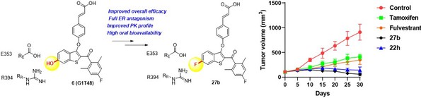 目前,雌激素受体下调剂(SERD)fulvestrant是治疗ER阳性耐药性乳腺癌的主要用药,但是其肌肉注射的给药方式使得患者依从性较差,可口服的SERD的研发就成了当下研究重点和难点。课题组通过前期实验基础发现,将在临床上的口服SERD G1T48进行结构改造,引入氟原子,改善了药代动力学性质,提升了口服生物利用度,提高了抗肿瘤效果,为ER+晚期乳腺癌的治疗提供了更多可能。