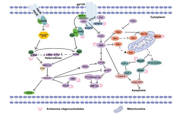 The schematic diagram of antisense oligonucleotides clinically designed for tumor targets.
