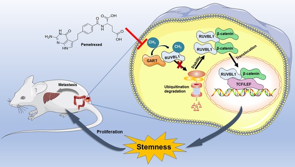 GART prompts methylation of RUVBL1 to promote CRC stemness via maintaining RUVBL1 stability and the combination of pemetrexed is a promising treatment for CRC.