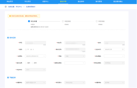 注意所有带星号的项目均为必填项。备注中请勿填写信息。如发现有无法修改的内容(身份证号、民族等)存在错误请联系辅导员,公司汇总好错误信息报员工职业发展指导中心统一修改。
