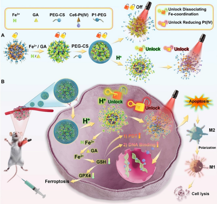 中药富含多种功能化合物,具有复杂的药理作用机制,明确中药的药效药理等命运变化过程是中药功能化合物研究的前沿热点。tyc122cc太阳成集团齐若谷教授团队运用超分子化学原理,将光动力激活的铂类药物与多酚类中药没食子酸联合,创新设计构建出高聚物离子锁螯合前药分子探针,实现中药成分的分子水平精准作用机制,展示了中药成分与传统化疗药物结合后刺激巨噬细胞极化并诱发铁死亡的光动力过程,为中药功能化合物的开发提供了新的思路和方法。该研究论文“Sequential dual-locking strategy using photoactivated Pt(IV)-based metallo-nano prodrug for enhanced chemotherapy and photodynamic efficacy by triggering ferroptosis and macrophage polarization”发表于Acta Pharmaceutica Sinica B(IF=14.5)。