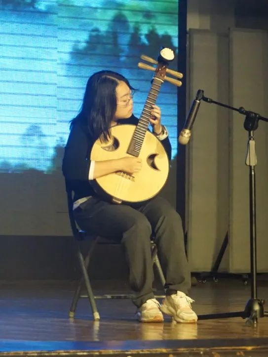 钟婕的中阮独奏《山行》音符醇厚圆润,如沉酿美酒般细腻悠长;罗宇航的独舞《流水桃花》姿态精准而富有韵味,如同一幅流动的山水画卷,舞毕,台下掌声雷动。