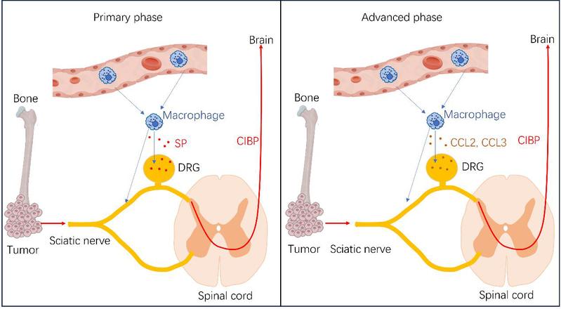 癌症诱导的骨痛(cancer induced bone pain,CIBP)是骨转移癌或骨肉瘤患者最常见的严重并发症之一,2022 年全球新发癌症病例约 2000 万,其中肺癌等恶性肿瘤易发生骨转移,导致患者出现难以忍受的骨痛,严重降低生活质量。长期以来,CIBP的神经免疫调控机制尚不明确,临床缺乏针对性的阶段化治疗方案。
