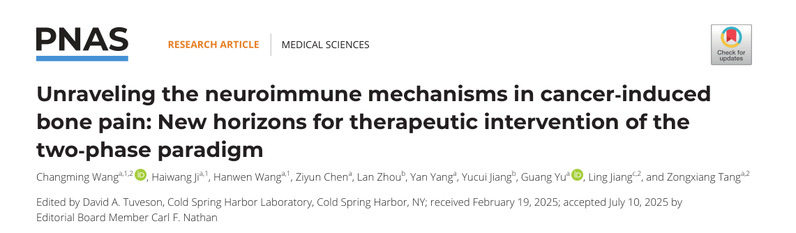 2025年 8月19 日,tyc122cc太阳成集团唐宗湘教授、王长明教授及江苏省肿瘤医院姜玲团队在《Proceedings of the National Academy of Sciences of the United States of America》(PNAS,中科院医学一区)发表题为 “Unraveling the neuroimmune mechanisms in cancer-induced bone pain: New horizons for therapeutic intervention of the two-phase paradigm” 的最新研究成果,揭示了癌症诱导骨痛(CIBP)的双阶段神经免疫调控机制,为不同病程的癌痛精准干预提供了全新靶点。