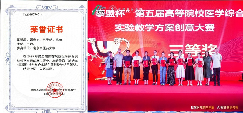 2025年7月,在全国高等院校基础医学形态学实验室主任联席会主办的第五届医学综合实验教学方案创意大赛中,董银凤副教授及教学团队设计的《脑缺血-再灌注损伤综合实验》荣获设计组三等奖。该方案聚焦于脑卒中前沿病理机制,通过模拟缺血-再灌注动态过程,创新构建“理论-实践-临床”三维教学体系,相关成果已应用于临床医学专业实验课程改革。