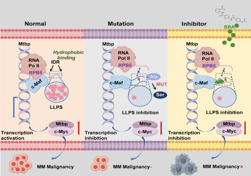 2025年11月12日,tyc122cc太阳成集团杨烨/顾春艳教授课题组在MedComm期刊(中科院一区/JCR Q1,IF:10.7)在线发表题为“Targeting the Liquid–Liquid Separation Region of c-Maf for Treating Chromosomal Translocations in Multiple Myeloma”的研究论文。多发性骨髓瘤(MM)是一种难以治愈的血液肿瘤,转录因子c-Maf不仅频繁参与MM相关的染色体易位,其自身亦具备发生液-液相分离(LLPS)的能力。尽管c-Maf因其转录因子特性长期被视为“不可成药”靶点,本研究提出干预其LLPS过程作为治疗新策略。通过系统的体内外实验证实,c-Maf可经由LLPS形成生物凝聚体,进而促进肿瘤进展。在机制层面,c-Maf的固有无序区(IDR)驱动相分离,并招募RNA聚合酶II,激活Mtbp/c-Myc信号通路。研究发现苯甲酰苯甲酸(BBA)可靶向结合c-Maf的IDR,破坏其LLPS过程,从而阻断RNA Pol II募集及Mtbp/c-Myc信号激活,有效抑制MM进展。该研究不仅揭示了c-Maf通过LLPS机制激活c-Maf/RNA Pol II/Mtbp/c-Myc信号轴推动肿瘤发生,同时验证了靶向相分离策略在治疗染色体易位相关MM中的潜在应用价值。