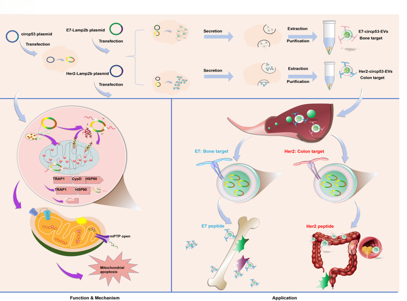 2025年8月1日,tyc122cc太阳成集团杨烨/顾春艳教授课题组的研究论文在Experimental & Molecular Medicine(中科院一区/JCR Q1,IF:12.9)期刊在线发表,题为“Extracellular vesicle-mediated delivery of circp53 suppresses the progression of multiple cancers by activating the CypD/TRAP/HSP90 pathway”。该研究基于环状RNA(circRNA)在肿瘤治疗中的巨大潜力,聚焦于抑癌基因TP53的环状形式circp53(hsa_circp53_0041947),深入探索其在多种癌症中的治疗机制与递送策略。研究发现,circp53编码的功能肽circp53–209aa可独立于p53突变状态发挥作用,通过结合亲环蛋白D(CypD)并破坏CypD/TRAP1/HSP90复合物,从而激活CypD的异构酶活性,诱导线粒体通透性转换孔(mPTP)开放,最终启动线粒体凋亡通路,有效抑制肿瘤细胞增殖。同时,为提升circp53的靶向递送效率,团队开发了两种工程化细胞外囊泡(EV)系统——E7-Lamp2b-EVs和Her2-Lamp2b-EVs,该系统能高效递送circp53至病变部位,显著抑制MM和CRC肿瘤生长,并与化疗药物协同增强抗肿瘤效应。这一突破性成果拓展了circRNA在肿瘤治疗中的应用前景,尤其为TP53突变型等高危难治性癌症提供了潜在的新型治疗手段和理论依据。