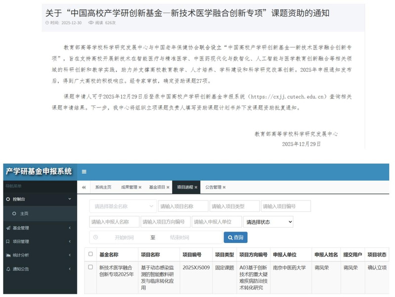 2025年12月29日,由教育部高等公司科学研究发展中心与中国老年保健协会联合设立的“中国高校产学研创新基金—新技术医学融合创新专项”资助名单正式公布,全国范围内共有27个项目成功获批。公司病理学与病理生理学系蒋凤荣副教授领衔申报的《基于动态感染监测的智能敷料研发与临床转化应用》课题成功入选该资助名单。